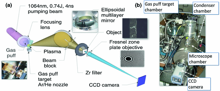a Scheme (not to scale) and b photograph of the EUV microscope using a laser-plasma EUV source based on gas-puff target