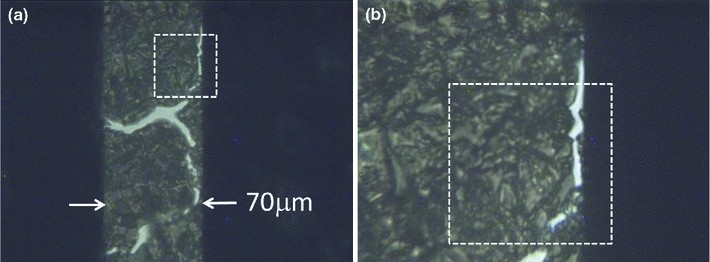 The EUV mosaic shown in Fig. 3b, on the other hand, does not reveal any surface features formed by the thick layer of crystallized salt. The crystals are several microns thick and their transmission at EUV wavelength of 13.8 nm is ~1.5 × 10−7 (Assumed NaCl thickness was 1 µm, using CXRO database, http://henke.lbl.gov/optical_constants/filter2.html). However, the EUV image shows regions with thickness smaller than ~100 nm that are represented by the bright regions. These are formed by very deep gaps in the NaCl layer and small cracks and holes in the supporting Si membrane. Intensity of these regions is related to their transmission and, as can be seen in Fig. 3b, some regions have higher transmission than the others. Despite the images are rather noisy, they confirm that EUV microscopy can be used, for example, in thin film studies with several advantages. Figure 3 shows that the EUV radiation used for image acquisition enhances some information about the object which is also present in the SEM image, however, more difficult to extract. The brightest regions indicate cracks in the supporting membrane, as can be observed comparing images of a 2–8 μm wide vertical crack, shown in top-right region of a dashed box in Fig. 2b and on the right in Fig. 3b. Other, less intense features are also visible suggesting lower object transmission and, in turn, higher thickness.