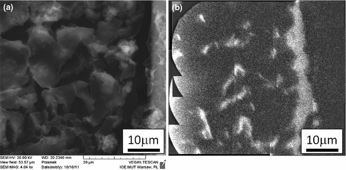 SEM image of the sample, ~50 × 50 μm2 with re-crystallized NaCl (a) and corresponding EUV image (b) showing the same region of the sample. EUV image was obtained by stitching and partially overlapping of 4 × 4 smaller EUV sub-images