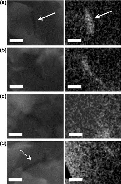 Comparison between small sections of SEM images (left column) and EUV images (right column) showing different areas of the sample. a, b Some cracks, as small as 100 nm, in the sample are deep all the way to the membrane and can be seen in both SEM and EUV images (marked with white arrows and c, d some of the features (marked with dotted arrow) are visible in the SEM images but are not present in the corresponding EUV image. Scale bar is 2 μm