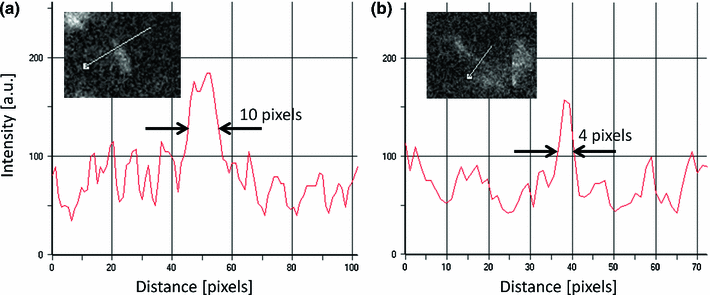 Intensity profiles of smallest features in the EUV images (a) showing visible features as small as 4 pixel wide (b)