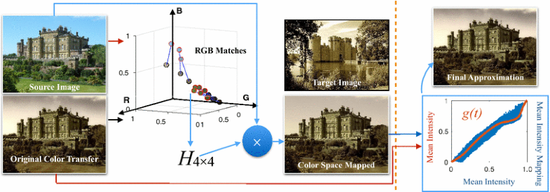 Pipeline of our color transfer decomposition. The “target” image was used by the “original color transfer” algorithms to produce the “original color transfer” output image, but it is not used by the proposed color transfer re-coding algorithm. The orange dashed line divides the pipeline into two steps: (1) color space mapping: The RGBs of the source image (drawn as red edge circles) and the original color transfer image (by [16] with the target image as the reference, black edge circles) are matched according to their locations (e.g., the blue matching lines), from which we estimate a 3D homography matrix H and use H to transfer the source image colors and (2) mean intensity mapping: The image mean intensity values (mean values of R, G, and B) are aligned by estimating the per-pixel shading between the color space-mapped result and the original color transfer result by least squares. The final result is a visually close color transfer approximation