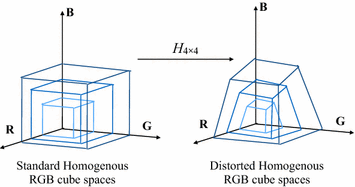 Homogeneous color space mapping. The left 3 homogeneous RGB cubes are equivalent (up to a scale). The left RGB space cubes can be mapped to the right by a \(4 \times 4\) 3D homography transform H