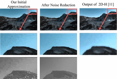 Minor noise reduction: Some JPEG block artifacts of our initial approximation are reduced via mean intensity mapping noise reduction step. Compared with our final approximation result (middle), the output of [11] contains significant blur artifacts at the boundary of the hill. Row 2 shows the magnified area in Row 1. Row 3 shows the shading image \(I_{D'}\) of the magnified area