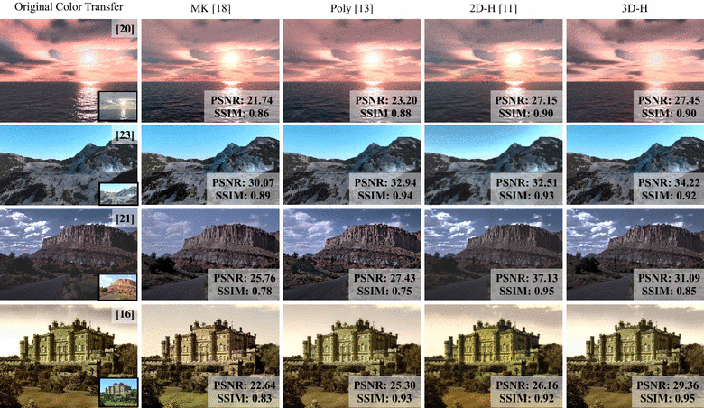 Various methods have been proposed for approximating an unknown photo-realistic color transfer for better speed and naturalness. Pitie et al. [18] proposed a color transfer approximation by a 3D similarity transform (\(\hbox {translation}+\hbox {rotation}+\hbox {scaling}\)) which implements a simplification of the earth mover’s distance. By restricting the form of a color transfer to a similarity transform model, some of the generality of the transfer can be lost such that the range of color changes it can account for is more limited. In addition, a color transfer looks satisfying only if the tonality looks natural and this is often not the case with the similarity transformation. Ilie and Welch [13] proposed a polynomial color transfer which introduces higher-degree terms of the RGB values. This encodes the non-linearity of color transfer better than a simple \(3\times 3\) linear transform. However, the nonlinear polynomial terms may over-manipulate a color change and introduce spatial gradient artifacts. Similarly, this method also does not address the tonal difference between the input and output images. Gong et al. [11] proposed a planar color homography model which re-codes a color transfer effect as a combination of 2D perspective transform of chromaticity and shading adjustments. Compared with [18], it requires less parameters to represent a non-tonal color change. The model’s tonal adjustment also further improves color transfer re-coding accuracy. However, the assumption of a 2D chromaticity distortion limits the range of color transfer it can represent. Their [11] tonal adjustment (mean intensity-to-shading mapping) also does not preserve image gradients and the original color rank. Another important work is probabilistic moving least squares [12] which calculates a largely parameterized transform of color space. Its accuracy is slightly better than [13]. However, due to its high complexity, it is unsuitable for real-time use. In this paper, we only benchmark against the color transfer re-coding methods with a real-time performance.