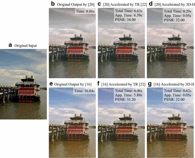Color transfer acceleration. The color transfers [16, 20] of an original image (a) are accelerated by our 3D-H color transfer re-coding method and a state-of-the-art method transform recipe (TR) [10]. The top right labels in (b) and (e) show the original color transfer time. The top right labels in (c, d) and (f, g) show the improved processing time and the measurements of similarity (PSNR) to the original color transfer output. “App. Time” indicates time for color transfer approximation only