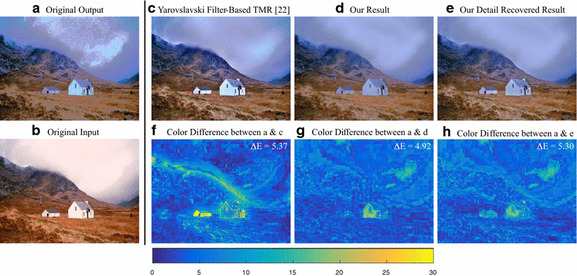 Artifact reduction comparison based on an original image (b) and its defective color transfer output (a). c is an artifact reduction result by a state-of-the-art method— transportation map regularization (TMR) [22]. d is our re-coding result where the artifacts are indirectly smoothed at the layer of shading scales. e is our alternative enhancement result which makes its higher-frequency detail similar to the original input image. f, g CIE 1976 Color Difference \(\Delta E\) [24] visualization of c–e where the average color difference is labeled at the top right corner. A lower \(\Delta E\) indicates a closer approximation to (a)