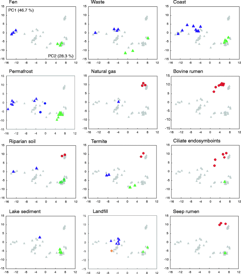 Distribution maps of methanogenic archaeal clones isolated from other anaerobic environments. The principal component analysis was based on evolutionary distances of methanogenic archaeal 16S rDNA sequences (E. coli position, 358-690); the PC1 and PC2 components of the principal component analysis indicate first and second principal components, respectively. Their respective contributing percentages are between brackets. Grey triangles indicate the clones obtained from the paddy field ecosystems; Red circle, Methanobacteriales; green triangle, Methanomicrobiales; blue triangle, Methanosarcinales; dark blue circle, unknown methanogen