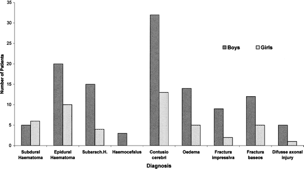 In our study, we examined the ApoE genotype in the group of 70 pediatric patients who suffered from traumatic brain injury and were treated at Clinic of Pediatric Surgery, Orthopedic and Traumatology in Brno Faculty Hospital from 2000 to 2005. The group consists of 48 boys (68.6%) and 22 girls (31.4%). The youngest patient was 1 month old, the oldest 17 years old, the mean age was 9.47 years, SD ± 4.87.