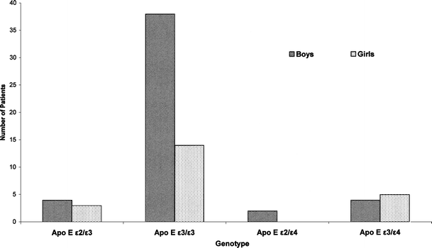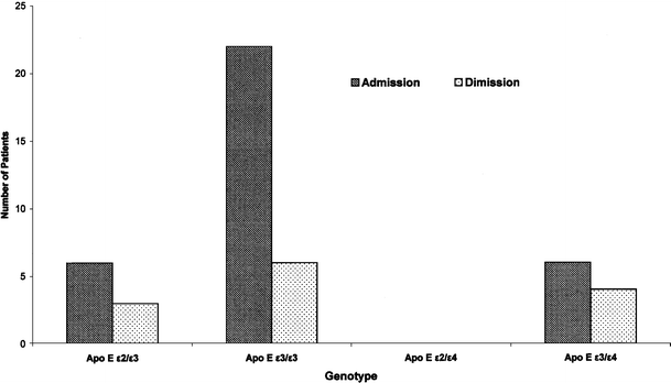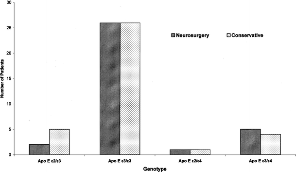 Previous clinical studies concerning the severities and outcome of traumatic brain injury in adults support the opinion that ApoE ɛ4 allele possession is associated with a poor prognosis and unfavorable outcome after the brain injury [2, 4, 5, 8, 10, 25, 26]. Patients possessing the ApoE ɛ4 allele had a significantly longer hospital stay and unfavorable outcomes after brain injury [2], had a significantly decreased postinjury performance on neuropsychological tests after the mild head injury [25], and had increased risk of late posttraumatic seizures [4]. It was also observed that patients with the ApoE ɛ3/ɛ3 genotype had a better chance of recovery after cardiopulmonary resuscitation than patients with ApoE ɛ4/ɛ4 genotype [22].
