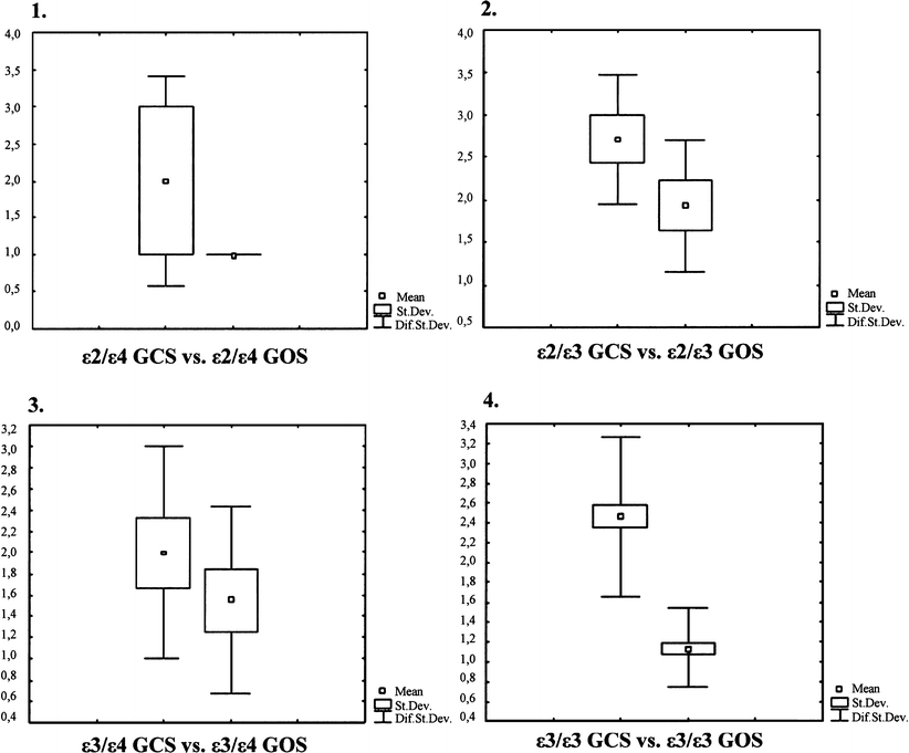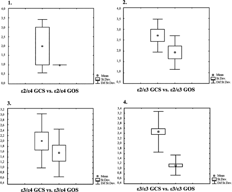 Using the Wilcoxon nonparametric test, significant difference between the trauma severity and outcome was observed for ApoE ɛ2/ɛ3 and ApoE ɛ3/ɛ3 genotype subgroups. Patients in subgroups containing the ApoE ɛ4 allele showed no statistical difference. The similar results were obtained by using the t test for the assessment of GCS/GOS differences. On the p < 0.05 level, there is the significant difference between GCS and GOS in ApoE ɛ3/ɛ3 genotype subgroup; also significant is the difference for ApoE ɛ2/ɛ3 genotype.
