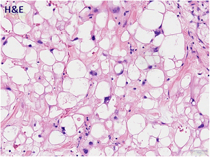 Histopathological imaging. The lesion shows vacuolated tumour cells with a pale cytoplasm and moderate nuclear polymorphism in a chondromyxoid matrix. These findings are a characteristic of chordoma