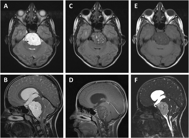 Preoperative MR images. a, b Axial and parasagittal T2-weighted MRI scans showing an inhomogeneous hyperintense prepontine lesion with a mass effect on the brainstem. c, d Axial and parasagittal T1-weighted MRI scan after administration of gadolinium contrast show inhomogeneous enhancement. e Axial T1-weighted MRI scan shows an inhomogeneous hypointense prepontine lesion. f Parasagittal constructive interference steady state (CISS) MRI scan shows an inhomogeneous hyperintense prepontine lesion