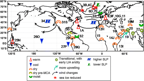 It has long been observed from proxy data that global climate during the past 1200 years can be divided into two periods, the “Medieval Climate Anomaly” (MCA, about 900–1350 AD) and the subsequent “Little Ice Age” (LIA; about 1500–1850) (e.g. Lamb 1965; Grove 1988). An early regional synthesis of MCA climate was provided by H. H. Lamb, who used documentary records to outline the case for general warmth in the North Atlantic-European sector and increased cool season precipitation across Britain during medieval time (Lamb 1965). Lamb, a meteorologist, recognized that the available evidence implied a “…shift in the upper westerlies, the depression tracks should have had an average position 1–3º north of the modern normal (1900–1939) position—a displacement that probably implies less sea ice …”—(Lamb 1965; also Lamb 1969), thus emphasizing the relationship between changes in circulation and surface climate, and the idea of modest (comparable with modern interannual variability) but persistent shifts in winter circulation over the North Atlantic and Europe during the MCA.