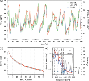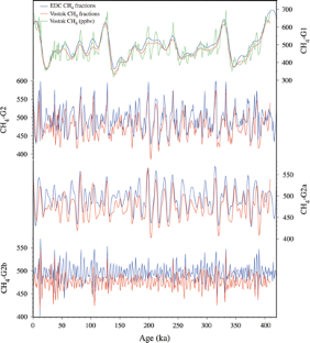 Loulergue L, Schilt A, Spahni R, Masson-Delmotte V, Blunier T, Lemieux B, Barnola JM, Raynaud D, Stocker TF, Chappellaz J (2008) Orbital and millennial-scale features of atmospheric CH4 over the past 800,000 years. Nature 453:383–386