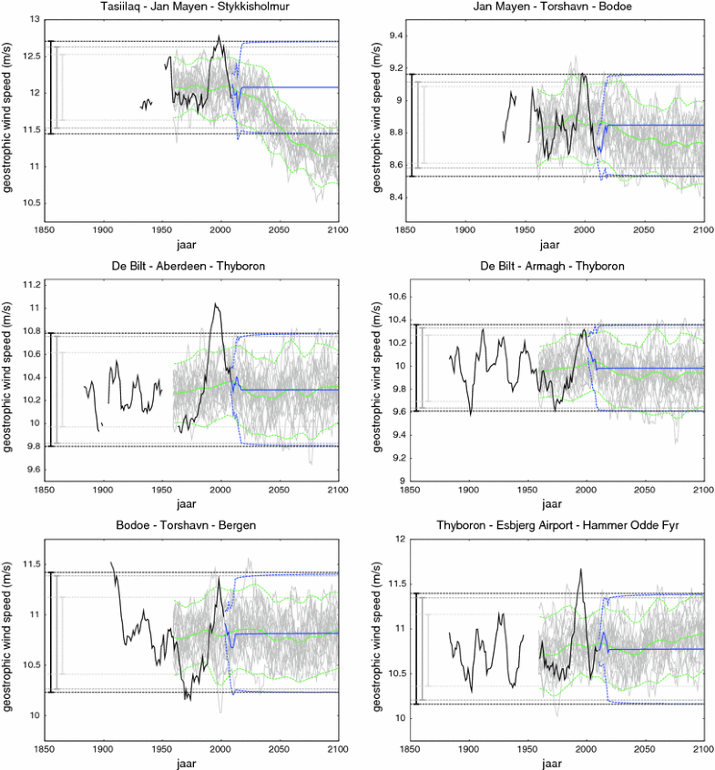 Past 10-year running mean of geostrophic wind speed together with diverse 95%-prediction intervals for future 10-year running mean. Lines are explained in Fig. 10