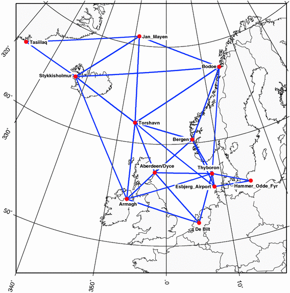 Two slp series are very likely to be continuations of older nearby stations, although this was not found in the meta-data of the ECA&D database. The annual mean slp values of Thyboron and Esbjerg Airport are very similar to Vestervig and Nordby (1874–1986) respectively, which are both available until 1986. Alexandersson et al. (1998) reported relocations between 1986 and 1987 for both pairs of stations. Applying Alexandersson’s coordinates rather than the ECA&D coordinates helps to remove an obvious inhomogeneity in the geostrophic wind speed series derived from the slp series of Thyboron, Esbjerg Airport and Hammer Odde Fyr.