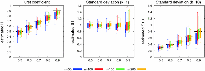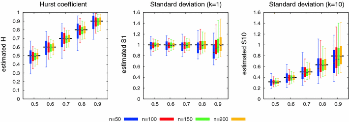 Boxplots (estimated of 1,000 samples) of ML-estimates for different true H (x-axis) and sample sizes (colours). The boxes represent the 1st and 3rd quartile, the black line the median and the whiskers the 5 and 95% quantiles. The underlying horizontal black line elements give the true values. Left: ML estimate \(\hat{H}\), centre: ML estimate \(\hat{\sigma}^{(1)}\) and right: ML estimate \(\hat{\sigma}^{(10)}\)