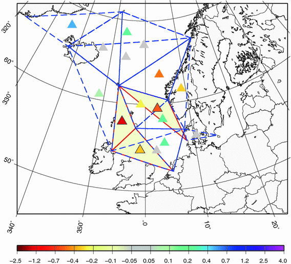 Estimated trends in geostrophic wind speed (ms−1/100 years). Shaded triangles (Aberdeen-Armagh-Torshavn, Aberdeen-Armagh-De Bilt & Torshavn-Bergen-Thyboron) have been tested significant, using a Mann–Kendall trend test adapted for LTP