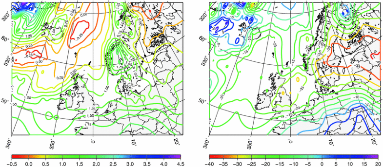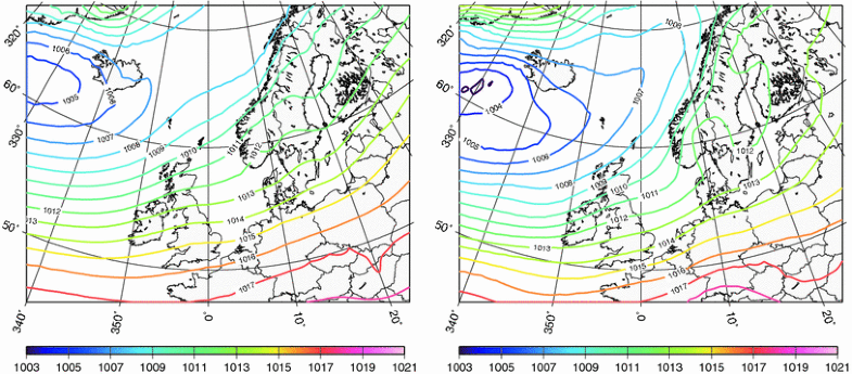 Long-term mean mean sea level pressure (hPa) according to ERA40 (left) and ESSENCE (right)