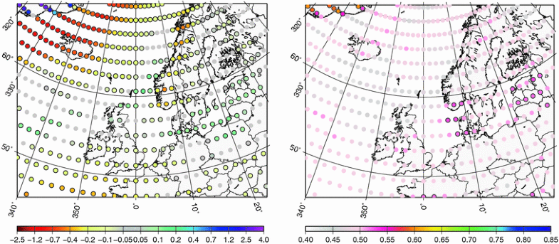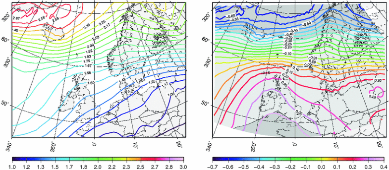 Difference (ESSENCE—ERA40) in mean geostrophic wind speed [ms−1] (left) and in coefficient of variation (CV) of the annual mean geostrophic wind speed [%] (right)