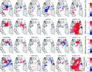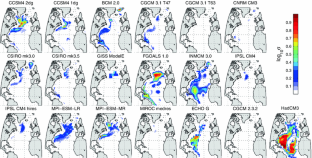 We acknowledge the modeling groups, the Program for Climate Model Diagnosis and Intercomparison (PCMDI) and the WCRP’s Working Group on Coupled Modelling (WGCM) for their roles in making available the WCRP CMIP3 multi-model dataset. Support of this dataset is provided by the Office of Science, U.S. Department of Energy. We are grateful to Dr. Johann Jungclaus and to Dr. Jonathan Gregory for providing data of MPI-ESM and HadCM3, respectively. Simulations with CCSM4 were carried out on the ’bluefire’ system of the Computational and Informations Systems Laboratory (CISL). Simulations with IPSL CM4 hires were funded by the EC-FP6 project ‘ENSEMBLES’. Additional compute time was provided by the Swiss National Supercomputing Centre (CSCS). A. B. is supported by the European Commission under the Marie Curie Intra-European Fellowship ECLIPS (PIEF-GA-2011-300544) and the ‘National Centre for Excellence in Research: Climate’ of the Swiss National Science Foundation.