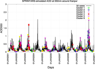 The present study focuses on identifying the main atmospheric circulation characteristics associated with aerosol episodes (AEs) over Kanpur, India during the period 2001–2010. In this respect, mean sea level pressure (MSLP) and geopotential height of 700 hPa (Z700) data obtained from the NCEP/NCAR Reanalysis Project were used along with daily Terra-MODIS AOD550 data. The analysis identifies 277 AEs [AOD500 > \( \overline{AOD} \) 500 + 1STDEV (standard deviation)] over Kanpur corresponding to 13.2 % of the available AERONET dataset, which are seasonally distributed as 12.5, 9.1, 14.7 and 18.6 % for winter (Dec–Feb), pre-monsoon (Mar–May), monsoon (Jun–Sep) and post-monsoon (Oct–Nov), respectively. The post-monsoon and winter AEs are mostly related to anthropogenic emissions, in contrast to pre-monsoon and monsoon episodes when a significant component of dust is found. The multivariate statistical methods Factor and Cluster Analysis are applied on the dataset of the AEs days’ Z700 patterns over south Asia, to group them into discrete clusters. Six clusters are identified and for each of them the composite means for MSLP and Z700 as well as their anomalies from the mean 1981–2010 climatology are studied. Furthermore, the spatial distribution of Terra-MODIS AOD550 over Indian sub-continent is examined to identify aerosol hot-spot areas for each cluster, while the SPRINTARS model simulations reveal incapability in reproducing the large anthropogenic AOD, suggesting need of further improvement in model emission inventories. This work is the first performed over India aiming to analyze and group the atmospheric circulation patterns associated with AEs over Indo-Gangetic Plains and to explore the influence of meteorology on the accumulation of aerosols.