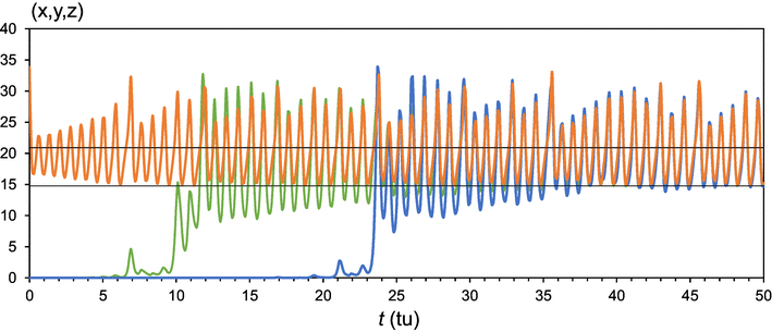 Evolution of the LAR (orange) and local ensemble average RMSE (green and blue curves for initial perturbation sizes of \({10^{ - 2}}\) and \({10^{ - 7}}\), respectively) of the vector (x, y, z) for the Lorenz63 model. The initial value is (− 4.0, 5.0, 20.0). The upper and lower black lines are the GAR and attractor radius, respectively