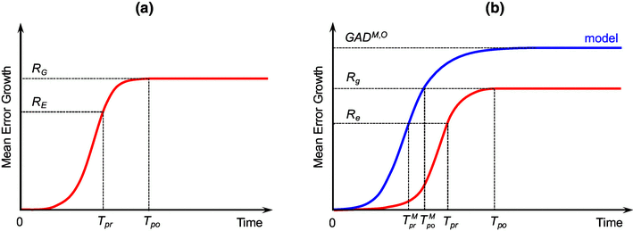 a Schematic illustration of the typical mean error growth (measured as the global ensemble average RMSE, red) of a nonlinear chaotic system as a function of time, and the relationships of the practical predictability limit (T pr ) and potential predictability limit (T po ) to the attractor radius (R E ; lower dashed line) and GAR (R G ; upper dashed line). b Same as in (a) but for the error growth of a model forecast (blue) and the determination of the practical predictability limit (\(T_{pr}^{M}\)) and potential predictability limit (\(T_{po}^{M}\)) of the model. The upper, middle and lower horizontal dashed lines represent the GAD (GAD M,O ) between the real attractor and model attractor, the minimum R g the GARs of real attractor and model attractor, and the minimum R e of the attractor radii of real attractor and model attractor, respectively