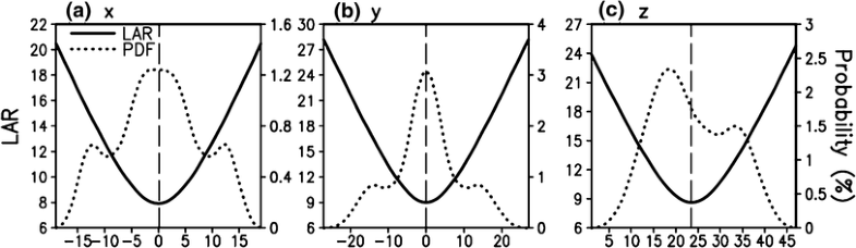 Distribution (solid line) of the marginal LAR and probability density function (PDF dotted line) for the variables (a) x, (b) y, and (c) z in the Lorenz 63 model. The dashed line represents the mean state