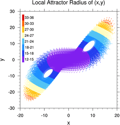 Projections of the LAR on the x–y plane in the phase space of the Lorenz63 model. 1 × 105 points are plotted