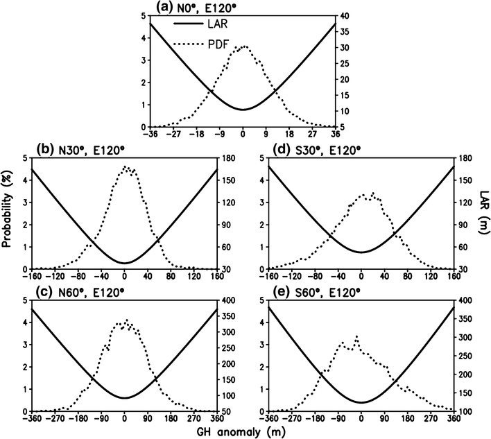 Distribution (solid line) of LAR and the probability density function (PDF; dotted line) for geopotential height (GHT) at 500 hPa in the coupled Climate Forecast System (CFSv2) of the National Centers for Environmental Prediction (NCEP) at five grid points: a (0°N, 120°E), b (30°N, 120°E), c (30°S, 120°E), d (60°N, 120°E), and e (60°N, 120°E)