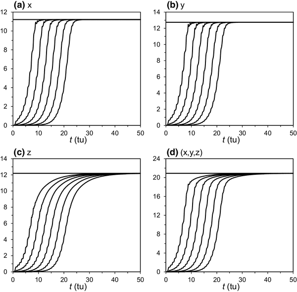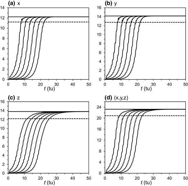 Deficiencies in numerical models are an important source of forecast errors. A simple case, the Lorenz63 model, is used as the real system with an imperfect forecast model, as described in Sect. 3. The difference between the two models results from a small deviation in the parameter b in the imperfect model (see Sect. 3). Figure 8 shows the evolution of the global ensemble mean RMSE of the variables x, y, and z and vector (x, y, z) of the imperfect Lorenz63 forecast model. The error growth of the imperfect Lorenz63 forecast model is similar to that of the Lorenz63 model (Fig. 6), but because of the system bias, the GAR of the former is significantly larger than that of the latter. Thus, the error growth of the imperfect model alone cannot be used to determine its predictability of the perfect system, and the global ensemble mean RMSE between the Lorenz63 model and the imperfect Lorenz63 model must be used. As shown in Fig. 9, the global ensemble mean RMSE between the Lorenz63 model and the imperfect Lorenz63 model converges to the GAD between the two models. Moreover, error growth curves with initial errors of different magnitude coincide—i.e., they are independent of the magnitude of the initial errors. This implies that, in this case, model errors, and not small initial errors, play the dominant role in forecast error growth. The global practical and potential predictability limits of the imperfect Lorenz63 model are 0.8 and 1.9 for the vector (x, y, z), 0.8 and 1.9 for x, 0.8 and 1.8 for y, and 0.8 and 2.6 for z, respectively. These predictability limits are much shorter than those of the original Lorenz63 model (Fig. 7). This reflects the predictability deficiencies of the imperfect model when used to forecast the evolution of the ‘perfect’ Lorenz system. However, a practical problem is that the existing models are inevitably of model errors. Applying a forecast model to investigate predictability is also an important tool and approach. It is very important to understand how to use a forecast model to estimate the attractor radius and global attractor radius and the predictability limits. To this end, we need to learn how large is the GAD between the real attractor (it could be estimated by using observational or long analysis data series if the exact equations of the system are unknown) and the model attractor, and take it into account. Usually we may choose a forecast model with smaller GAD between its attractor and the real attractor to study predictability and estimate the predictability limits.