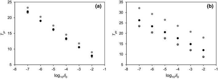 a Global practical predictability limit \({T_{pr}}\) and b potential predictability limit \({T_{po}}\) of the Lorenz 63 model with respect to initial error. The open circles, crosses, gray dots, and black dots correspond to the variables x, y, and z, and the vector (x, y, z)