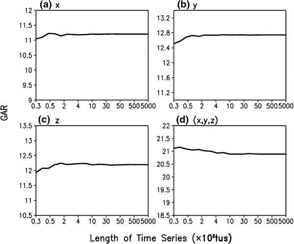 Figure 2 shows the variations of the marginal GARs for the variables x, y, z and the GAR for the vector (x, y, z) in the Lorenz63 model as a function of time-series length. The figure shows that for any variable or vector, the marginal GAR or GAR initially varies slightly, and then gradually approaches a constant value with time. The fact that the evolution trajectory tends to spread over the whole attractor implies that the GAR is an invariant quantity. The marginal GARs for the variables x, y, z and the GAR for the vector (x, y, z) are 11.21, 12.74, 12.19, and 20.90, and the marginal attractor radii and the attractor radius of the system are 7.92, 9.01, 8.62 and 14.78, respectively. A proportional relationship of \(\sqrt 2\) between the attractor radius and the GAR exists, as proved in Sect. 2.