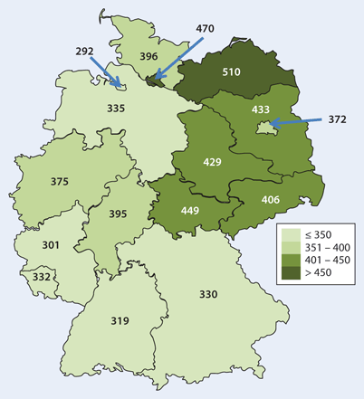 Abbildung 19: Implantationsrate pro 1 Million Einwohner in den einzelnen deutschen Bundesländern (korrigiert nach Vollständigkeit, Minimaldatensätze berücksichtigt)
