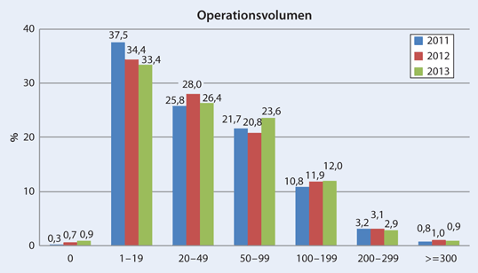 Die in 2011 neu eingeführte Kategorie „0“ in Tab. 2 berücksichtigt die Tatsache, dass es unter den meldenden Einrichtungen Häuser gibt, die ausschließlich Revisionen, Systemwechsel oder Explantationen durchgeführt haben. Ob es sich hier um Institutionen handelt, die ICD explantiert haben, z. B. im Rahmen einer Herztransplantation, ansonsten aber die operative Therapie bei Patienten mit kardialen Rhythmusimplantaten an andere abgegeben haben, bleibt Spekulation.