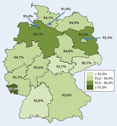 Abbildung 20: Grad der leitlinienkonformen Indikationsstellung zur ICD-Implantation in den einzelnen deutschen Bundesländern