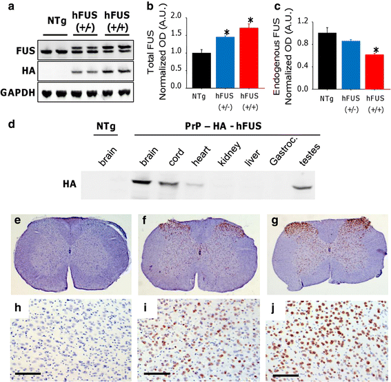 Overexpression of hFUS in mice dose dependently decreases endogenous Fus expression. a Western blotting of brain lysate from NTg and hFUS (+/−) and (+/+) mice using an anti-FUS antibody showed a slight shift to a higher molecular weight due to the presence of the HA tag and the larger protein size, and there was a dose-dependent increase in HA-hFUS and total FUS expression in transgenic animals (b), accompanied by a concomitant decrease in endogenous Fus expression (c) (mean ± SEM; * p < 0.05). d Western blotting of tissue lysates with anti-HA antibody showed highest levels in brain, spinal cord and testis, with lower levels in skeletal muscle (Gastroc gastrocnemius), heart and other tissues. (e–j) Immunohistochemistry with anti-HA antibody showed expression of the hFUS protein throughout the spinal cord (e–g) and in the cortex (h–j; scale bar 100 μm) in both hFUS (+/−) (f, i) and (+/+) (g, j) mice, which was absent in NTg animals (e, h)