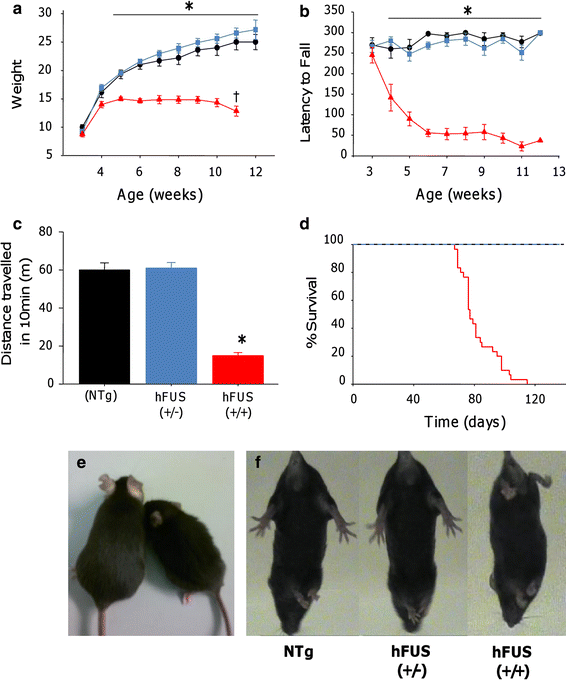 Overexpression of hFUS in mice results in motor dysfunction and premature death. a hFUS (+/+) (filled triangles) mice show a failure to gain weight from 4 weeks of age, and are significantly lighter than their NTg (filled circle) and hFUS (+/−) (filled rectangle) littermates from 5 weeks old mice. In addition, they display a significant reduction in weight from their maximum at 11 weeks of age. b hFUS (+/+) mice display significant impairment and rapid decline in performance on the rotarod from 4 weeks of age. c 8-week-old hFUS (+/+) mice display a significant reduction in locomotor activity compared to their NTg and hFUS (+/−) littermates. All data shown are mean ± SEM; * p < 0.05. d Survival curve showing an average survival of 82 ± 12 days for hFUS (+/+) mice, while hFUS (+/−) survival does not significantly differ from NTg mice. e Representative example of an 8-week-old hFUS (+/+) mice (right animal) compared to its NTg littermate (left animal). f Abnormal hind limb splay in 8-week-old hFUS (+/+) mice