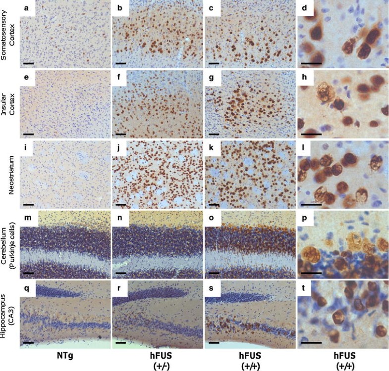 FUS staining in brain regions associated with motor or cognitive function in hFUS animals. Overexpression of HA-hFUS resulted in a dose-dependent increase in FUS staining in the somatosensory (a–c) and insular (e–g) cortices, the neostriatum (i–k), the Purkinje cells of the cerebellum (m–o) and a portion of the CA3 region of the hippocampus (q-s) (scale bar 50 μm). Higher power images of homozygous animals reveal skein-like and diffuse cytoplasmic staining in the somatosensory (d) and insular (h) cortices, the neostriatum (i) and the Purkinje cells of the cerebellum (p) and to a much lesser extent in the hippocampus (t) (scale bar 20 μm)