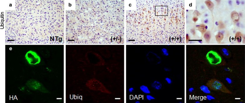 FUS staining does not colocalise with ubiquitin in the cortex. a–c Ubiquitin positive neurons were increased in the motor cortex of hFUS (+/+) (c) and to a much lesser extent (+/−) (b) animals compared to NTg controls (a) (scale bar 50 μm), and d weak ubiquitin staining is prevalent in hFUS (+/+) mice (scale bar 20 μm). e Fluorescent labelling of HA-tagged FUS and ubiquitin in the motor cortex of a hFUS (+/+) mouse shows cytoplasmic FUS deposits surrounded by ubiquitin, and diffuse granular cytoplasmic Fus staining accompanied by small ubiquitin positive cytoplasmic granules but no co-labelling of the two proteins (scale bar 5 μm)