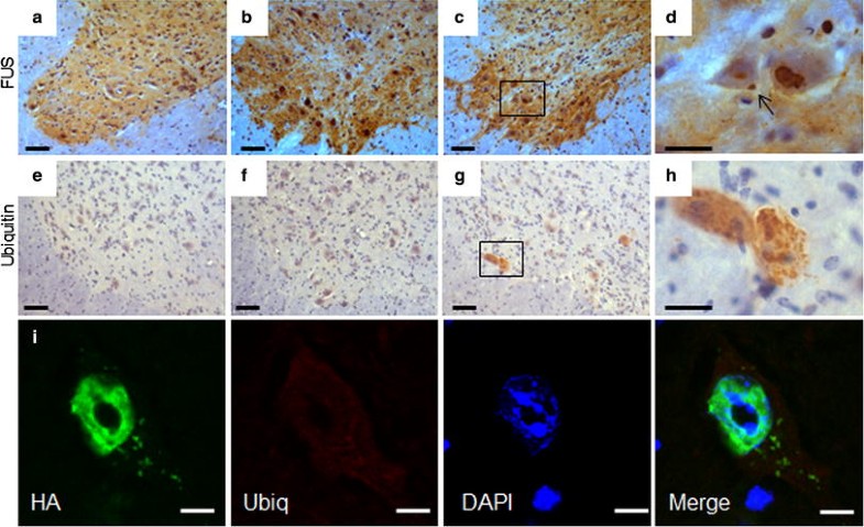 FUS and ubiquitin spinal cord pathology in hFUS mice. a–c FUS expression in the anterior horn of the spinal cord was increased in both (+/−) (b) and (+/+) (c) hFUS mice compared to their NTg littermates (a) (scale bar 50 μm). d A higher power image showing the presence of a FUS inclusion (arrow) in a large neuron of a hFUS (+/+) animal. (scale bar 20 μm). There was no evidence of inclusions in either hFUS (+/−) or NTg animals. e–g Abnormal granular ubiquitin was only present in a few large neurons of hFUS (+/+) (g) animals, with no significant staining in the anterior horn of the spinal cord of either NTg (e) or hFUS (+/−) (f) animals (scale bar 50 μm). h A higher power image showing rather diffuse, granular ubiquitin staining throughout two large neurons, with no obvious large inclusions visible (scale bar 20 μm). i Fluorescent labelling of HA-tagged FUS and ubiquitin in a neuron of the anterior horn of the spinal cord of a hFUS (+/+) mouse shows multiple small FUS inclusions in the cytoplasm of the cell with diffuse, low-level ubiquitin staining throughout the cytoplasm, but no evidence of HA-FUS and ubiqitin colocalisation (scale bar 5 μm)
