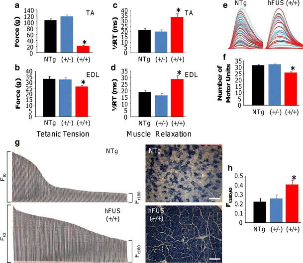 Neuromuscular function in hFUS mice. a, b Tetanic force production of the hind limb TA (a) and EDL (b) muscles was significantly reduced in hFUS (+/+) mice compared to NTg mice, with a deficit in force of approximately 80 and 20 % in the TA and EDL, respectively. c, d Muscle relaxation in both muscles was significantly slowed in hFUS (+/+) mice compared to both NTg and hFUS (+/−) animals. e, f Motor unit number was recorded from the EDL of all groups. Typical examples of motor unit traces from an NTg and hFUS (+/+) mice are shown in (e), and the results of mean motor unit survival are summarised in the bar chart (f) demonstrating a loss of 20 % of motor units in hFUS (+/+) mice. g Characteristic fatigue traces from a NTg and hFUS (+/+) mouse, generated by tetanic stimulation of the fast EDL muscle over 180 s. Each tetanic contraction is represented by a single line in the trace, and the length of the line is relative to the force produced. The length of the force trace at F t180 (time = 180 s) as a ratio of that at F t0 gives a fatigue index (FI). Wild-type mice lose a large proportion of force at the end of the stimulation period compared with the beginning of the trace, thus having a low FI. In contrast, in hFUS (+/+) mice the EDL is less fatigable, as indicated by the higher FI. On the right of each trace is a cross-section of TA muscle obtained from NTg and and hFUS (+/+) mice stained for SDH. NTg animals display a mix of darkly stained, oxidative type I fibres and lightly stained, less oxidative fast type II fibres. In contrast, hFUS (+/+) mice display mainly dark staining, suggesting a transformation of muscle fibres into a slower phenotype. h Summary of FI in EDL muscle of NTg and hFUS (+/−) and (+/+) mice.