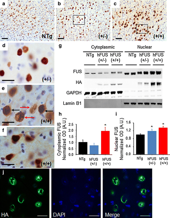 hFUS overexpression results in a significant shift in cytoplasmic localisation in homozygous animals. (a–c) FUS expression in the motor cortex was increased in both (+/−) (b) and (+/+) (c) hFUS mice compared to their NTg (a) littermates (scale bar 50 μm). d A higher power image of the hFUS (+/−) section reveals mainly nuclear and perinuclear FUS staining (scale bar 20 μm). e A higher power image of the hFUS (+/+) section shows many neurons with cytoplasmic staining (black arrows) that is absent in both hFUS (+/−) and NTg mice. In addition, ring-like perinuclear FUS staining is evident in numerous cells in both hFUS (+/+) (red arrows), and to a lesser extent hFUS (+/−) animals (scale bar 20 μm). f A second high power image showing cytoplasmic staining in cortical neurons of the hHUS (+/+) brain even in the absence of abnormal ring-like accumulations. g Western blotting of nuclear and cytosolic fractions from brain demonstrated an increase in both cytosolic and nuclear FUS levels. GAPDH was used as the marker for the cytosolic fraction, and Lamin B1 for the nuclear fraction. h Quantification of cytosolic FUS levels, showing an increase in FUS levels only in hFUS (+/+) animals (* p < 0.05). i Quantification of nuclear FUS levels, showing an expression-dependent increase in FUS in transgenic mice (* p < 0.05). j A representative confocal image demonstrating the ring-like nature of the inclusions observed in hFUS (+/+) cortical neurons (scale bar 20 μm)