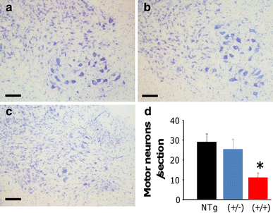 For motor neuron counts, perfused lumbar spinal cords from four animals per genotype were serially sectioned, and every 6th section (30 μm) was analysed. Sections were mounted, dried, incubated overnight in 1:1 ethanol/chloroform to de-fat the sections, stained for 10 min in warm 0.1 % cresyl violet, dehydrated and coverslipped. To compare the number of motor neurons, large neurons greater than 30 μm in diameter (based on their Fret’s diameter as assessed by Image J software) in the anterior horn of the lumbar spinal cord were counted in 15 sections. Data were assessed statistically by one-way ANOVA, followed by the post hoc Tukey test.