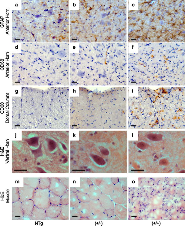 Increased neuroinflammation in the cord of hFUS mice accompanied by muscle atrophy. a–c Significant FUS expression-dependent increases in astrogliosis, detected using GFAP immunohistochemistry, were apparent in the anterior horn of the spinal cord in both (+/−) and (+/+) hFUS mice (scale bar 20 μm). d–i FUS expression-dependent increases in microglial activation, detected using CD68 immunohistochemistry, were apparent to a mild extent in the anterior horn of the spinal cord, (d–f) and more dramatically in the dorsal columns (g, h) of hFUS (+/+) mice. A very few cells were also present in hFUS (+/−) animals (arrows) (scale bar 20 μm). j–l Haematoxylin and eosin staining of spinal cord shows no evidence of eosinophilic inclusions in surviving motor neurons of end-stage hFUS (+/+) mice. m–o Haematoxylin and eosin staining of muscle showing scattered and grouped muscle fibre atrophy, characteristic of motor neuron degeneration in hFUS (+/+) mice, with some evidence of muscle fibre disorganisation in hFUS (+/−) animals (scale bar 20 μm)