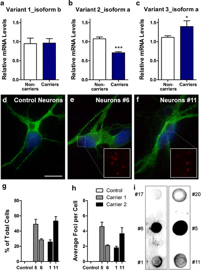 C9ORF72 repeat expansions form RNA foci in patient iPSCs-derived neurons. Expression levels of C9ORF72 variant 1 (NM_145005.5, isoform b) (a), variant 2 (NM_018325.3, isoform a) (b) and variant 3 (NM_001256054.1, isoform a) (c) in iPSC-derived neurons from two non-carriers and two expanded repeat carriers were assessed by qRT-PCR. Values are mean ± SEM, ***p < 0.001, *p < 0.05 (Student’s t test). FISH analysis was done on control iPSC-derived neurons (d), carrier 1 line 6 iPSC-derived neurons (e), carrier 2 line 11 iPSC-derived neurons (f) using a cy3-conjugated (GGCCCC)4 probe. Green MAP2. Blue DAPI. Scale bar 10 μm. Quantifications of the percentage of neurons displaying foci (g) and the average number of foci per cell (h) are presented as mean ± SEM, based on analysis of neurons derived from three independent differentiation experiments. Gly-Pro dipeptide repeats are detected by dot blot analysis in neurons of carrier 1 (iPSC lines 5 and 6) and carrier 2 (iPSC lines 1 and 11) (i)