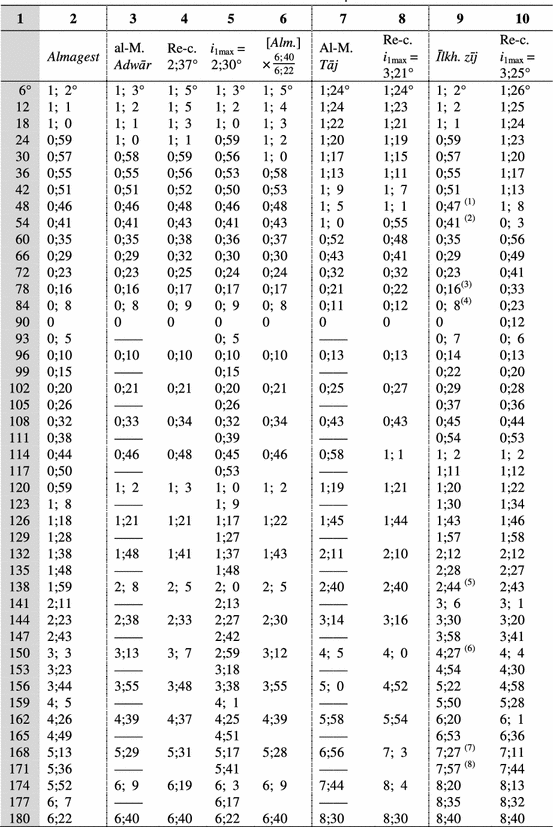 - al-Ṭūsī, Naṣīr al-Dīn, Ilkhānī Zīj, MSS. C: University of California, Caro Minasian Collection, no. 1462; T: University of Tehran, Ḥikmat Collection, no. 165 + Suppl. P: Iran, Parliament 6517 (Remark: The latter is not actually a separate MS, but contains 31 folios missing from MS. T. The chapters and tables in MS. T are badly out of order, presumably owing to the folios having been bound in disorder), P: Iran, Parliament Library, no. 181, M: Iran, Mashhad, Holy Shrine Library, no. 5332a.Google Scholar