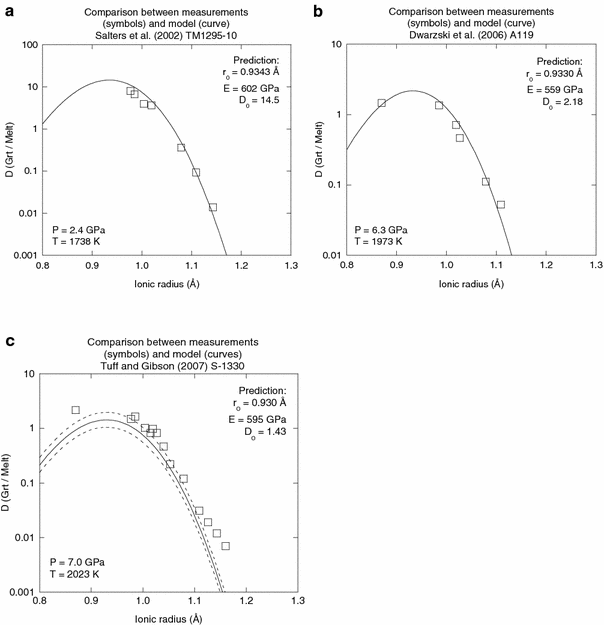 Comparison between measurements (symbols) and predictions using the models for r 0, E, and D 0 presented in this study (solid curves, constructed by combining Eqs. 1, 3, 6, and 18). Data are shown for a representative low-pressure, low-temperature garnet (a, from Salters et al. 2002), and representative majorite-poor and majorite-rich garnets at high P and T (b, from Dwarzski et al. 2006 and c, from Tuff and Gibson 2007). Dotted curves in c illustrate how predicted values vary if experimental charges were at temperatures 25 K lower (upper curve) or higher (lower curve) than indicated by the thermocouple junction